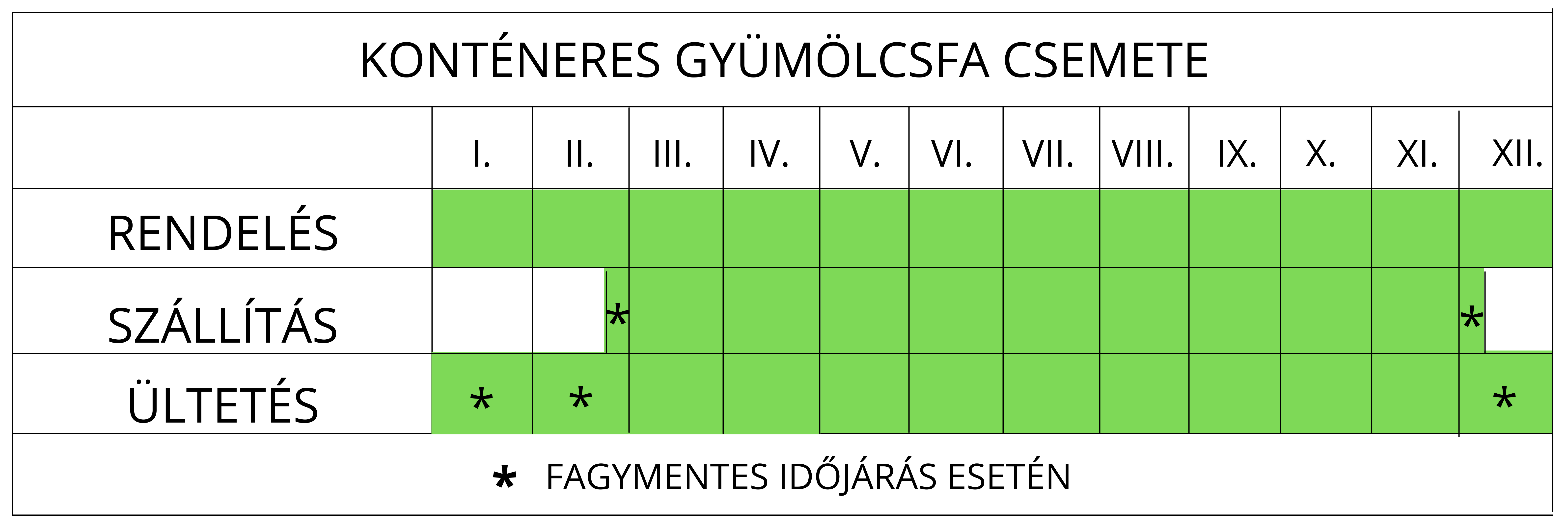 Szállított növény jellemzői: konténeres (cserepes) 3 éves kis koronás fa, az év bármely fagymentes időszakában ültethető